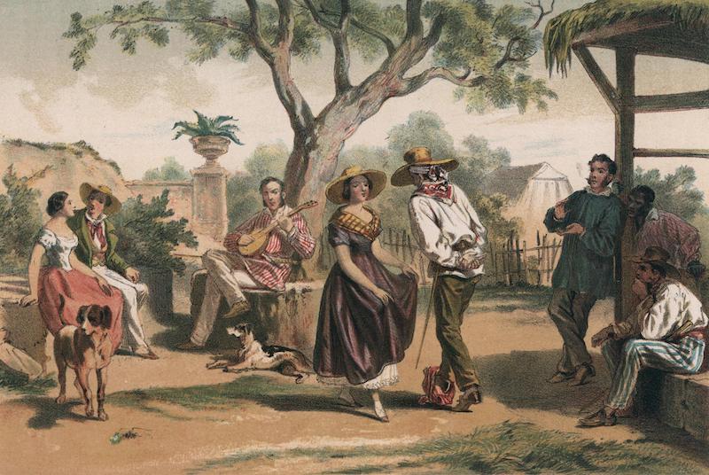 […] the guitar or violin is introduced, and singing commences: but the song soon gives the way to the enticing negro dance. I use this term as best assimilating amusement in question, which is a mixture of the dances of Africa, and the fandangoes of Spain and Portugal. It consists of an idividual of each sex dancing to an insipid thrumming of the instrument, always to one measure, with scarcely any action of the legs, but with every licentious motion of the body, joining in contact during the dance in a manner strangely immodest. […] It is not minuets or country dances are not known, and practised by the higher circles; but it is the national dance, and all classes are happy when throwing aside punctilio and reserve, and, I may add, decency, they can indulge in the interest and raptures it excites. The effect of this scene on a stranger can hardly be concived, and though, as an amusement, it may be intentionally harmless, it certainly breaks down the barriers of decency, and of course paves the way to depravity and vice”8.
